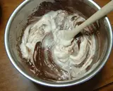 再次搅拌蛋白霜至光滑后,将1/3的蛋白霜加入步骤⑥的混合物中,充分搅拌,使面糊变得柔软。然后将剩余的蛋白霜分两次轻轻混入。