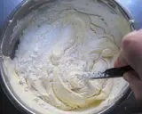 筛入低筋面粉,用刮刀从底部捞起面糊,像切面糊一样轻轻搅拌。边转动碗边搅拌会更容易(※请确保不要过度搅拌♪)。