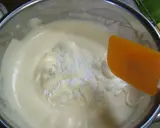 加入面粉后是关键步骤。注意不要过度搅拌,但一定要从底部翻转搅拌,使面糊均匀。之前我尝试使用手持搅拌器简化这个步骤,结果成品差别很大。虽然手工操作比较费力,但精心制作的蛋糕才是最美味的。照片中的鲜奶油量为150cc,可根据个人喜好增减。