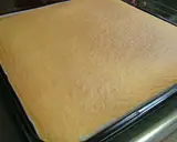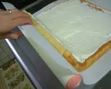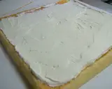 将蛋糕从烤盘中取出,并轻轻去除烤纸。(慢慢进行,避免损伤蛋糕表面)在蛋糕下方铺上一张比蛋糕更大的纸。(可以使用取下的烤纸)