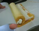 将擀面杖放在纸的下面,一起提起。首先紧紧卷起蛋糕的前端,形成一个芯。