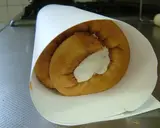 如果最后有鲜奶油溢出,可以用刮刀去除,并将蛋糕卷紧到最后。用手轻轻按压蛋糕,调整形状。