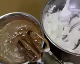 [海绵蛋糕]: 在蛋黄碗中加入食用油,搅拌均匀,然后加入热水继续搅拌。筛入粉类后混合均匀。然后加入1/3的蛋白,混合均匀后再加入剩余的一半蛋白,继续搅拌。此时继续使用手动搅拌器。