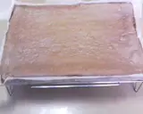 烘烤完成后,保持烘焙纸贴在底部,将蛋糕放在网架上冷却。稍微冷却后,用保鲜膜紧紧覆盖以防干燥(取下保鲜膜时,表面不会被粘住,蛋糕表面会更光滑)