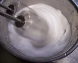 当蛋白变得蓬松时,逐渐加入剩余的砂糖并继续打发。