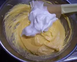 将1/3左右的蛋白霜加入步骤9的混合物中,用木铲或橡皮刮刀轻轻搅拌。
