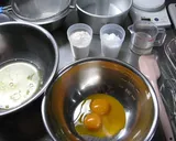 准备材料:将鸡蛋分为蛋黄和蛋白。面粉过筛一次。可以将●中的水和油一起称量。开始预热电烤箱至200℃。