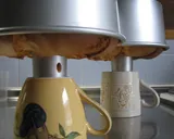 完成烘烤:将蛋糕倒扣在茶杯等上冷却。也可以用小的饼干模具将蛋糕固定倒扣冷却♪