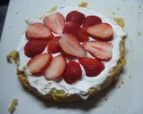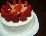 将冷却后的蛋糕(步骤6)横向切成两片,在切面上涂抹步骤7的糖浆。涂上八分硬的奶油,然后铺上切成四片的草莓,再涂一层奶油。