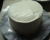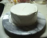 将两片蛋糕叠在一起,用八分硬的奶油涂抹整个蛋糕。这一步不需要完全涂得很整齐。