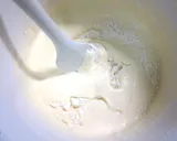 加入过筛的面粉,搅拌至没有干粉为止。然后将融化的黄油撒入,轻轻搅拌均匀,注意不要过度混合。