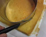 在模具内部铺上一片海绵蛋糕,用刷子涂上一半的糖浆。然后将慕斯薄薄地挤在蛋糕表面。