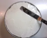 将留存的慕斯用抹刀薄薄地涂抹在海绵蛋糕表面,填补空隙。然后放入冰箱冷藏数小时至凝固。