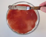 将不需加热加水的镜面果胶与过筛的覆盆子果酱混合,均匀地涂抹在蛋糕表面,最后脱模即可完成。