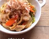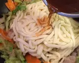 加入乌冬面和●的调味料,一边翻炒一边将面条拨散炒匀♪