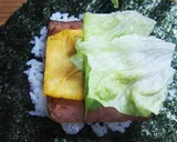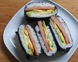 在海苔上方四方形地铺上一层米饭,然后放上午餐肉、煎蛋、生菜,根据个人喜好加上美乃滋,再在上面铺一层米饭。