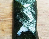 先将海苔的左右两侧包裹住,放置一会儿。然后再包裹上下两侧的海苔。将封口面朝下,静置一段时间。