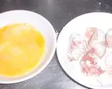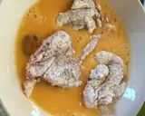 将鸡肉蘸上打散的蛋液后,用油炸。也可以用少量油慢慢煎炸。