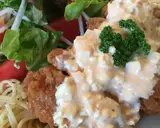 在肉上浇上塔塔酱就完成了♪
