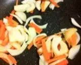 在平底锅中加热少许油(分量外),炒香切好的洋葱和胡萝卜♪