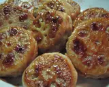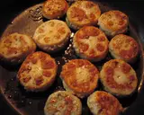 在平底锅中放油,将步骤4的莲藕夹肉放入煎烤。这时不要频繁翻动,耐心等待肉烤定型。盖上锅盖焖烤。