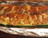 在小平底锅中,将金枪鱼和芹菜与西葫芦内馅一起炒熟,用a的调料调味,加入一半的芝士,混合后盛到西葫芦船中