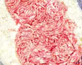 加入混合绞肉……。(混合绞肉选择颜色尽量接近粉红色的比选择红色的更好。不过不必太过在意。)