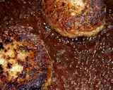 肉的表面要像这样光滑平整。禁止出现裂纹!在中间压一个凹槽,然后在平底锅中煎。先用中偏大火煎两面,然后改用小火煎两面。