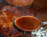 煮约5分钟后揭盖,一边摇动锅一边煮浓稠。用勺子舀酱汁淋在汉堡排上……。