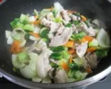 接着加入青梗菜和胡萝卜,继续翻炒。