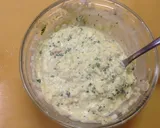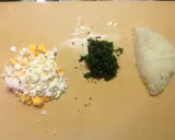 将煮熟的鸡蛋、香菜和洋葱切成小块,混合在一起,制作塔塔酱。