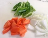 胡萝卜切成块状,洋葱切成瓣,青椒切成一口大小,放入耐热容器中,使用微波炉加热3分钟。