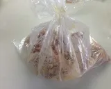 将腌制好的猪肉(或鸡肉)放入塑料袋中,均匀地撒上淀粉。