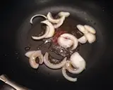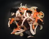洋葱炒至金黄色时,加入胡萝卜稍微翻炒一下,再加入虾仁、木耳和蘑菇,用大火翻炒至熟。