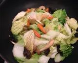 接着加入白菜和之前炒好的猪肉,继续翻炒至白菜稍微变软,然后加入盐和胡椒调味。